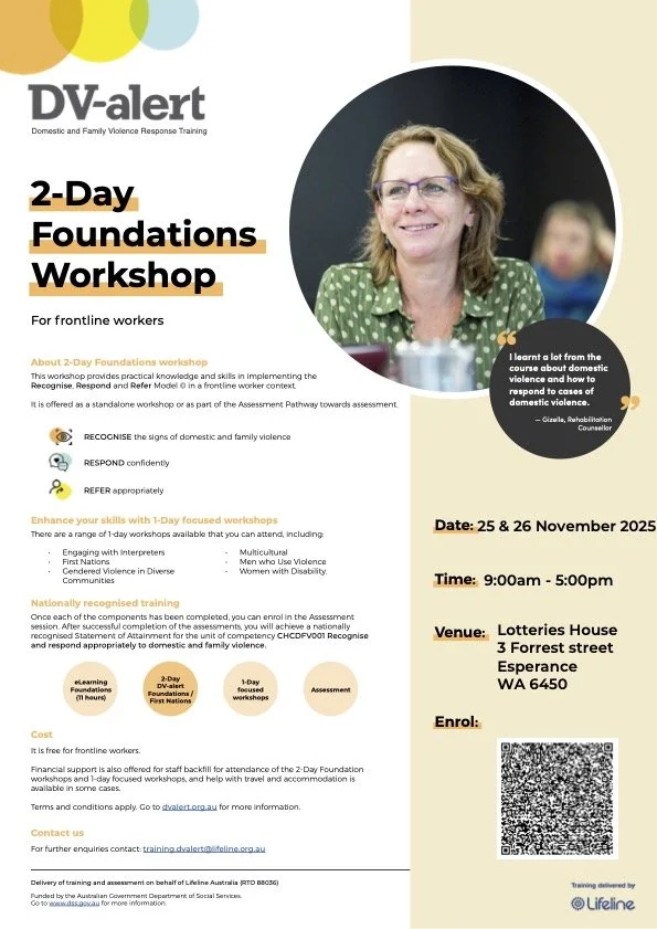 The FDV Outreach team visit towns Esperance to Ravensthorpe/Hopetoun and Norseman offering a comprehensive support service to women & children surviving in or escaping family and domestic violence.
